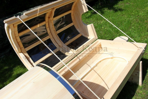 Горизонтальная двухрежимная фитобочка из кедра может быть использована как инфракрасная сауна и парная. Карбоновые излучатели отвечают за сухое парение и находятся на внутренней стороне дверцы. Влажное парение происходит за счет поступления горячего пара в фитобочку через паропровод. Горизонтальная форма позволяет принимать процедуры лежа. Внутренняя ручка из кедра облегчает открывание и закрывание двери во время парения. Такая модель наиболее удобна для оздоровительных центров.