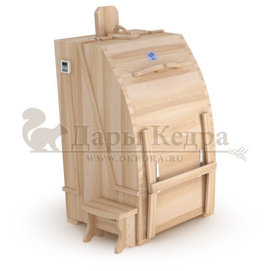 Квадратная двухрежимная фитобочка из кедра может быть использована как инфракрасная сауна и парная. Карбоновые излучатели отвечают за сухое парение, они находятся на внутренней стороне дверцы и задней стенке фитобочки. Влажное парение происходит за счет поступления горячего пара в фитобочку через паропровод. Толщина стенок составляет 40-45 мм, что позволяет увеличить срок службы изделия. Откидная дверь бочки во время открывания фиксируется внешней подставкой - опорой, которая в закрытом состоянии складывается и не занимает лишнее пространство. Во время парения человек сидит внутри кедровой бочки, а голова находится снаружи. Благодаря этому исключается возможность перегрева. Встроенная ручка на двери делают эксплуатацию фитобочки более удобной.